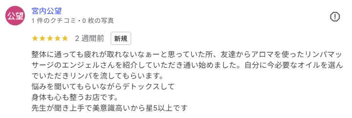 整体に通っても疲れが取れないなぁーと思っていた所、友達からアロマを使ったリンパマッサージのエンジェルさんを紹介していただき通い始めました。自分に今必要なオイルを選んでいただきリンパを流してもらいます。